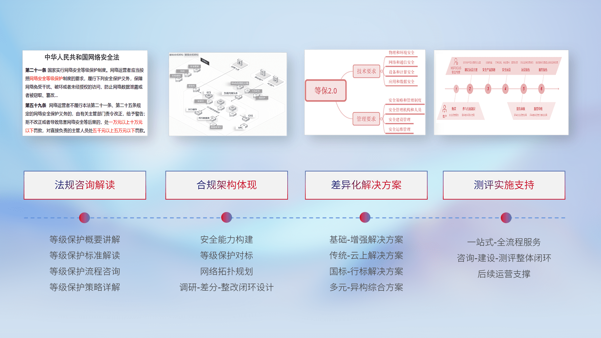 通过专业的法律咨询解读、、、合规架构体现、、、、差异化解决方案、、、、测试实施支持等服务,,为客户量身打造等保合规体系。。